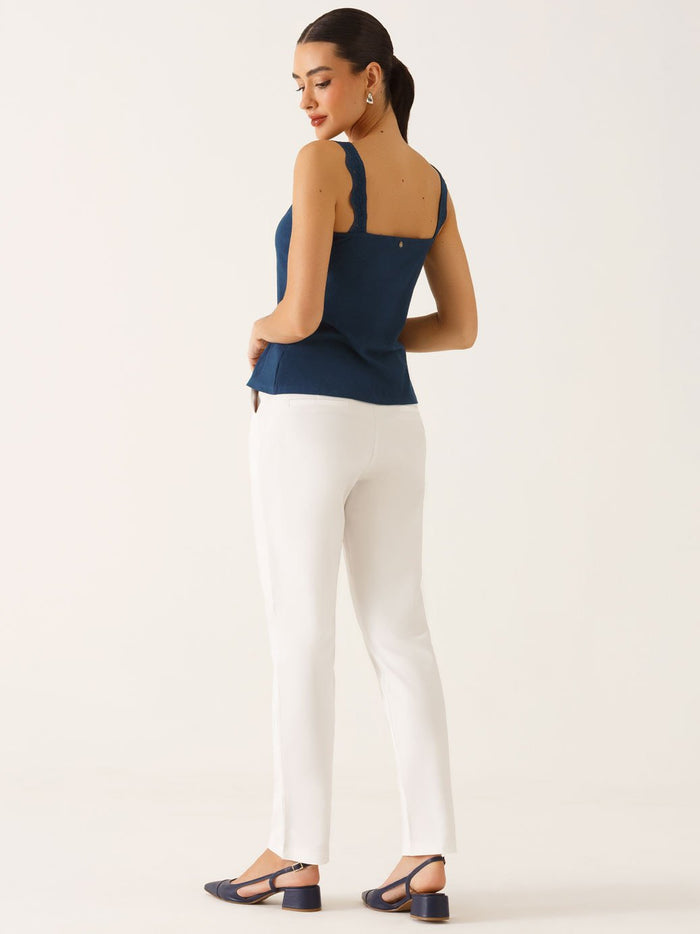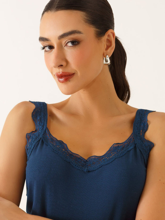 Regata Alças com Renda em Viscose Canelada Marinho Ticiana